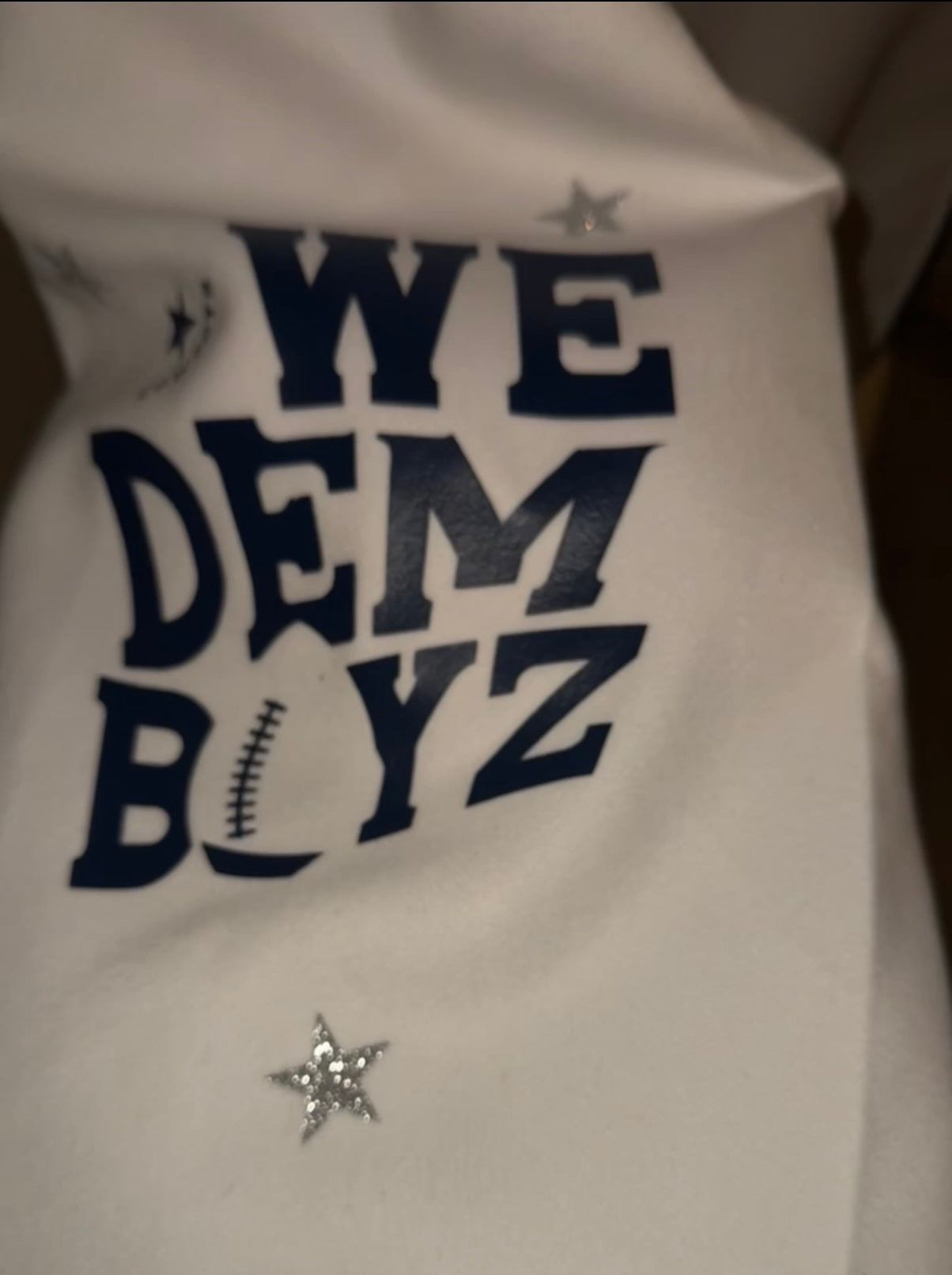 The back features a striking half-football design layered with the iconic Dallas skyline and “Dallas Cowboys” lettering, a tribute to the heart of the city. On the left chest, the Cowboys logo is surrounded by three stars, symbolizing excellence and pride. The right sleeve showcases “We Them Boys,” adding a touch of attitude and team spirit.